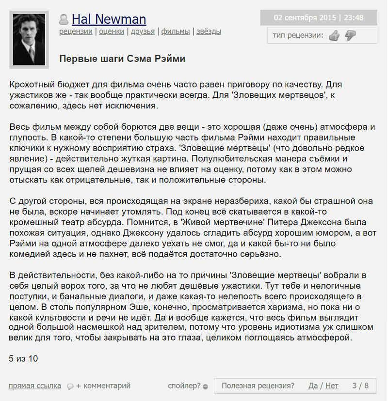 К «Зловещим мертвецам» все относятся положительно. Конечно, сквозь года трудно назвать эти фильмы чем-то культовым. Но это лишь из-за того, что многие их приёмы расхватали себе другие режиссёры. В то время это был очень страшный фильм. Конечно, начиная со второй части ужасов становилось всё меньше.